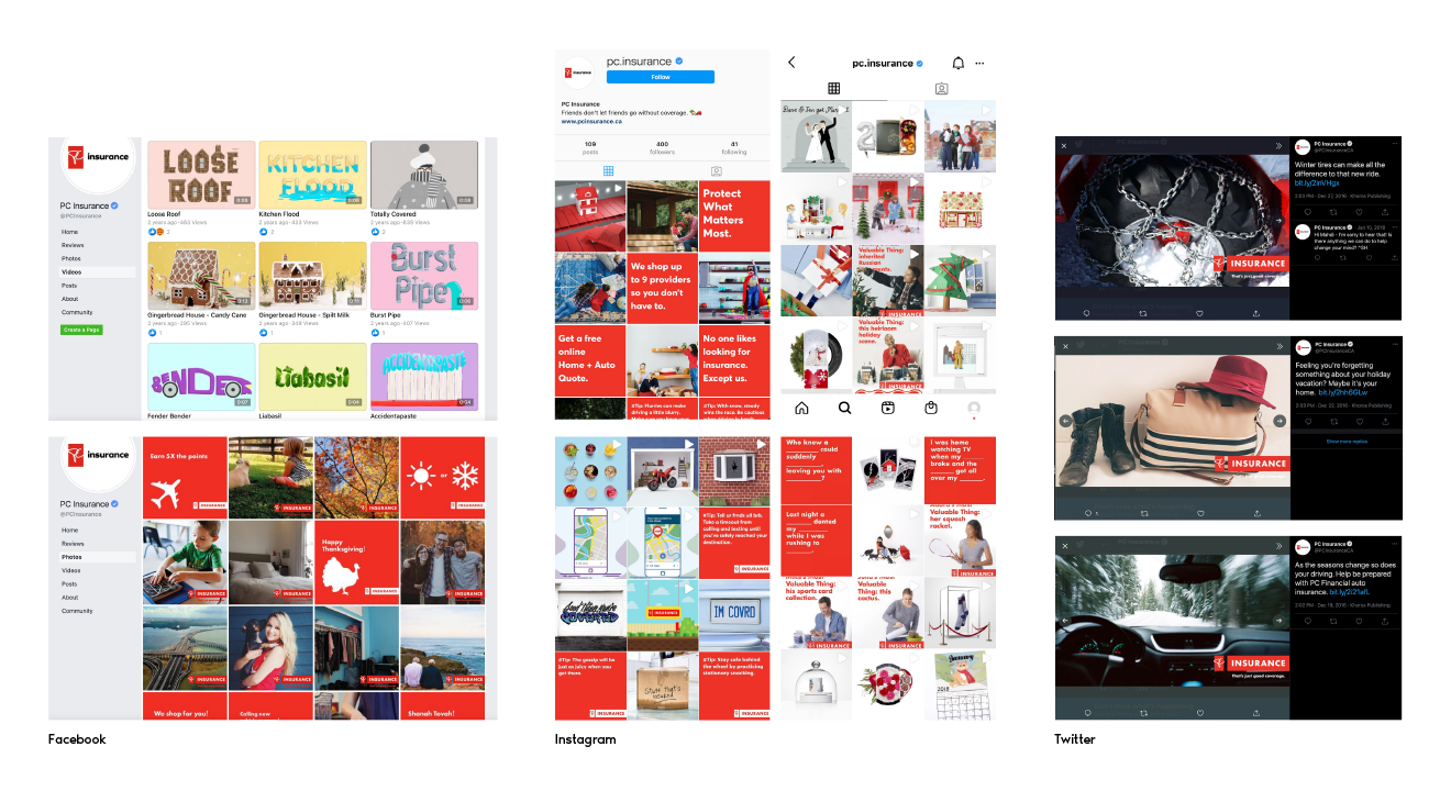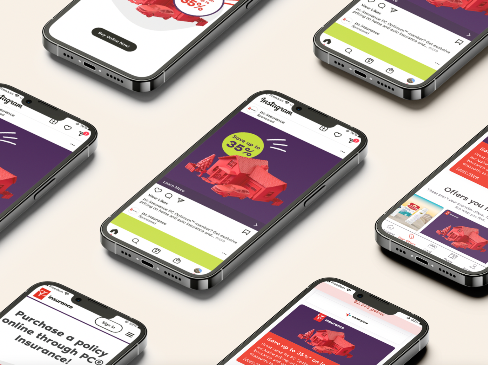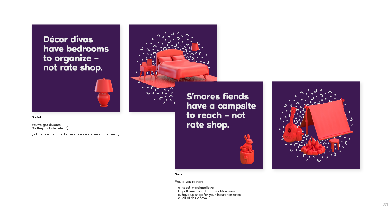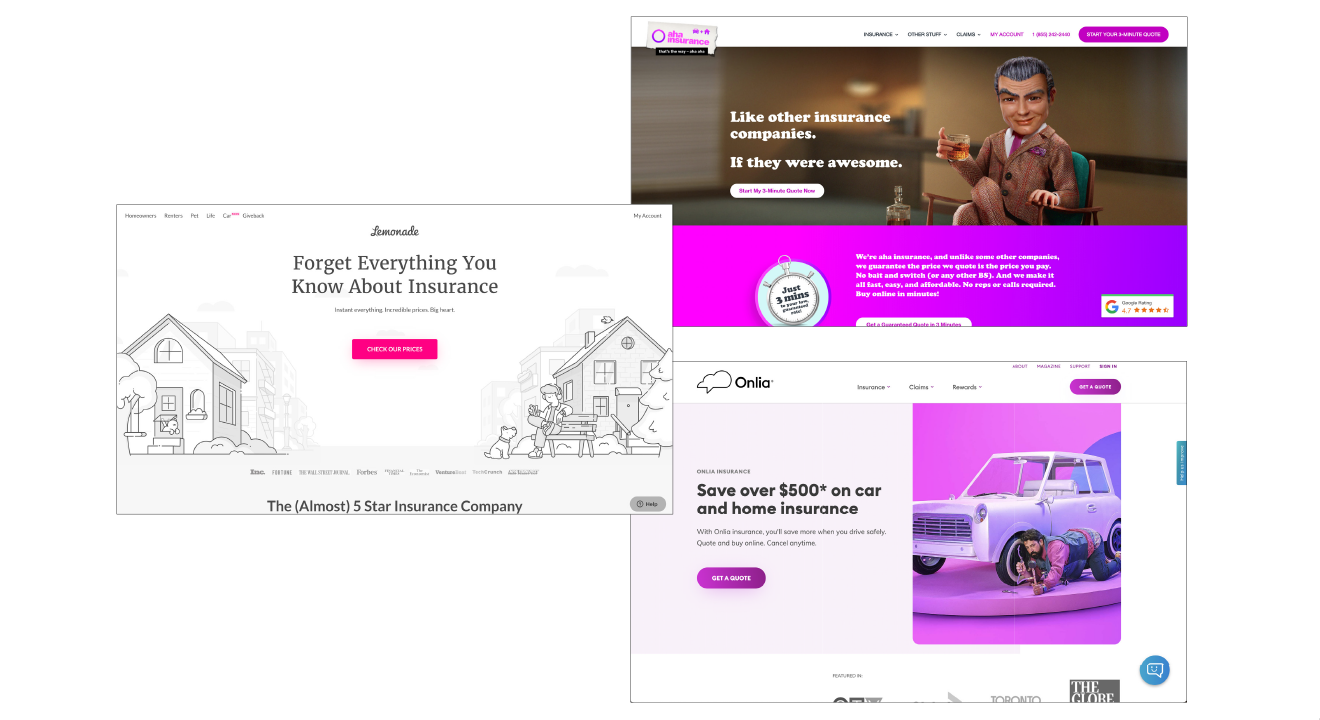The first step in the research was to get a clear picture of the competition and the overall landscape of the home and auto insurance market. I examined the imagery and colour choices used by other insurance companies and noted which ones felt dated or overused. I also explored how non-traditional insurance brands connect with their audiences (particularly younger customers) by simplifying their messaging and using fresh, unconventional branding approaches.
